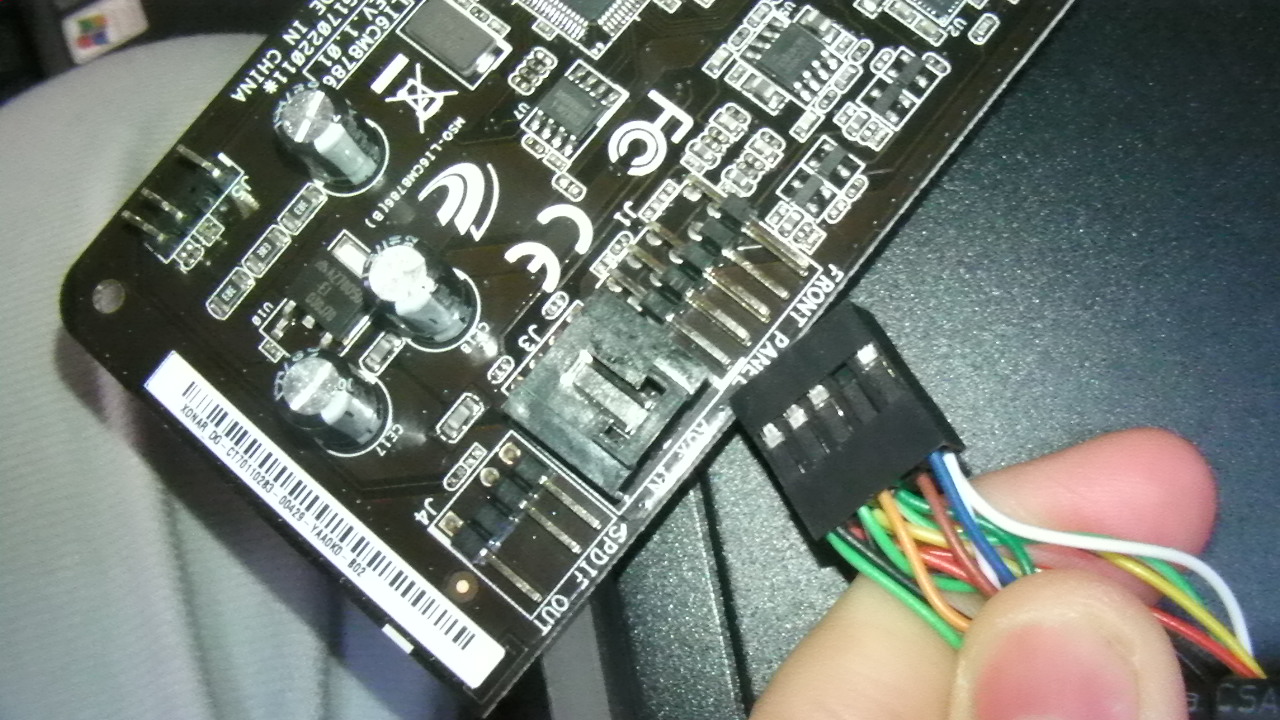 ちなみに、XonarDGは自動でフロント端子、自分の端子(リア端子?)に切り替えることはできないようです。アナログ出力のとこで自分で変えないと音がでません。自動で切り替えてくれるようです。フロントに端子がはいっていると、そっちが優先されるようです。抜いちゃうと自動で後ろの端子になりました(;´・ω・)ごめんなさいよくわかりません。フロントにスピーカーをつないでいるのに、ヘッドホンで出力されたりします。設定次第で自動で変えられると思いますが、